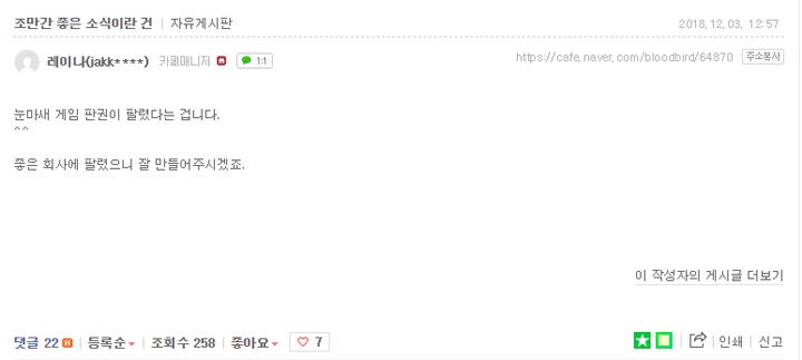 ì´ê±´ ëë§ìê° ìëë¤ í¬ëí"í¤ ê°ë°ì¤'ì¸ ëë§ì ì ì ë"¤ ê°íê² ë¹í 1boon from i.ytimg.com 어려운 요즘 고딩 말투 127: 요즘 학교일로 너무 정신없이 바쁘기도 하고, 질병관리청의 일을 직간접적으로 돕느라 글이 뜸했습니다.요즘 워낙 많은 연구결과들이 쏟아져 나오다 보니 구글 스칼라와 주요 저널의 레터만 보는 것도 허덕이고 있습니다. 그런데 눈마새 가져가서 무슨 육아게임 같은 걸 만드는 건 좀 너무한거였죠. Jun 29, 2021 · 이에 크래프톤 측은 28일 "금감원의 증권신고서 정정 요구에 성실히 응해 ipo 추진 등에 차질 없도록 하겠다"고 밝혔다. 식당에 안내견 출입 허용하면 개털알레르기는 어쩌. May 25, 2021 · 안녕하세요! May 25, 2021 · 눈마새, 피마새 게임과 영상판권을 크래프톤이 확보했고 이 계약 확장 논의는 1년 정도 전(모바일게임으로 불탈 때 담당자분이 좋은 소식 있으니 기다려 보라고 한 게 이거인듯) 눈마새 3, 4권 영문 번역 이 가능 했던 것이 이 판권료 때문으로 해외에 작품을 알리는 데 도움이 되었음. May 25, 2021 · 눈마새 게임은 어캐 다시 말아먹을까 1: